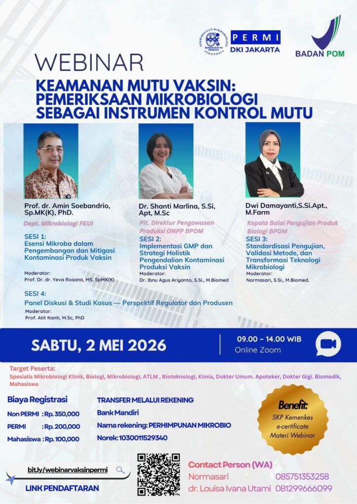 Dalam upaya meningkatkan kompetensi dan pemahaman tenaga kesehatan serta akademisi di bidang mikrobiologi, Perhimpunan Mikrobiologi Indonesia (PERMI) DKI Jakarta bekerja sama dengan Badan Pengawas Obat dan Makanan (BPOM) akan menyelenggarakan webinar ilmiah bertajuk: