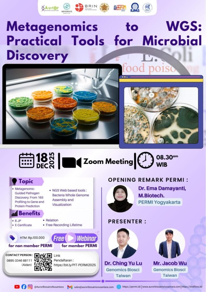 Yogyakarta / Online, 18 Desember 2025 — Dalam rangkaian hari ketiga Pertemuan Ilmiah Tahunan (PIT) PERMI 2025, PERMI Yogyakarta menyelenggarakan Workshop Bioinformatika bertajuk “Metagenomics to WGS: Practical Tools for Microbial Discovery” secara daring pada Kamis, 18 Desember 2025. Kegiatan ini diselenggarakan oleh Perhimpunan Mikrobiologi Indonesia (PERMI) bekerja sama dengan PT Auror Biosains Nusantara, Genomics Biosci Taiwan, PKR Biofilm UGM, serta Badan Riset dan Inovasi Nasional (BRIN).
